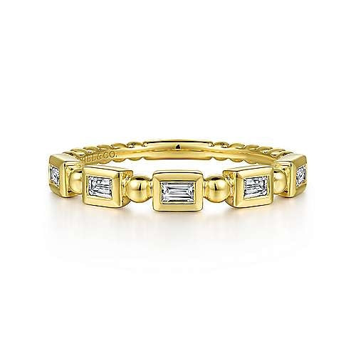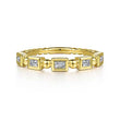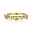 Five emerald diamonds are secured in 14k yellow gold bezels. This stackable band is one you will treasure forever!