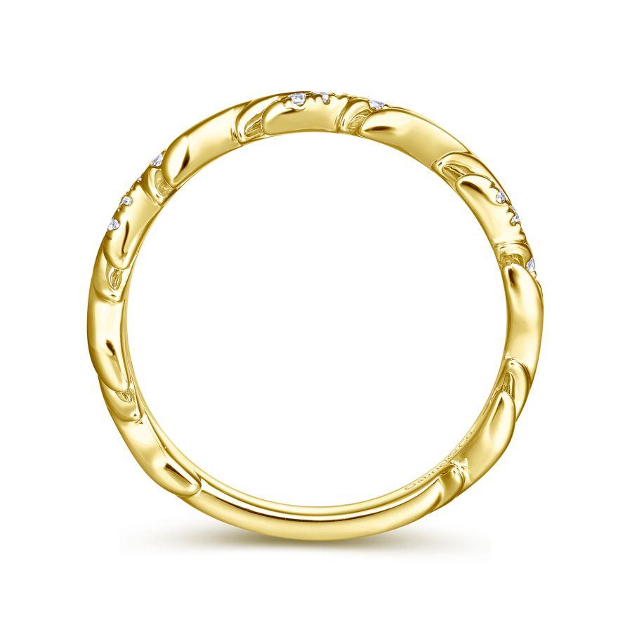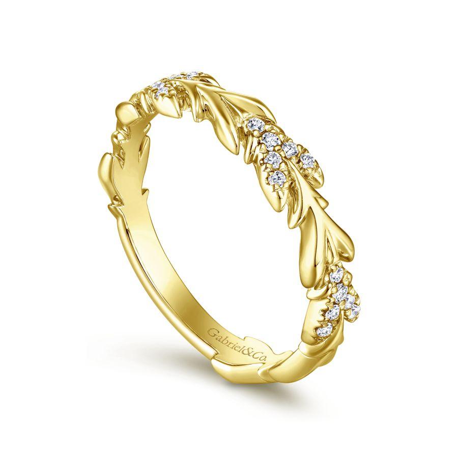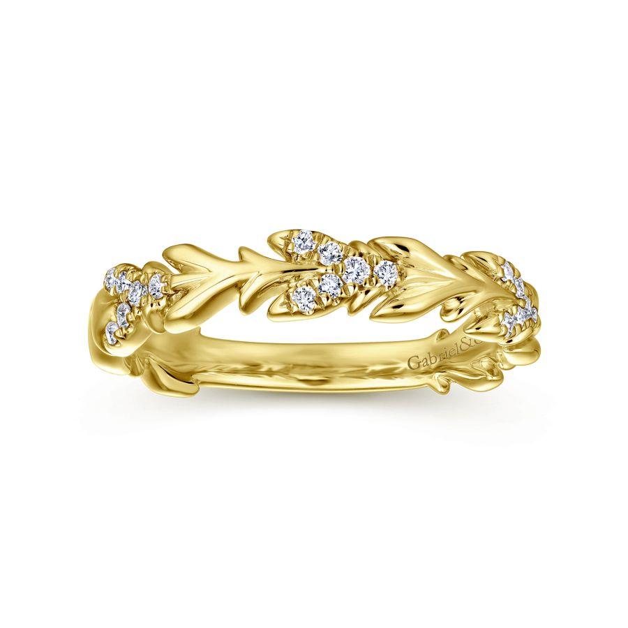 Score a style win with this polished laurel wreath inspired stackable ring. The gleaming 14k yellow gold design is embellished with brilliant 0.09ct pave diamonds.