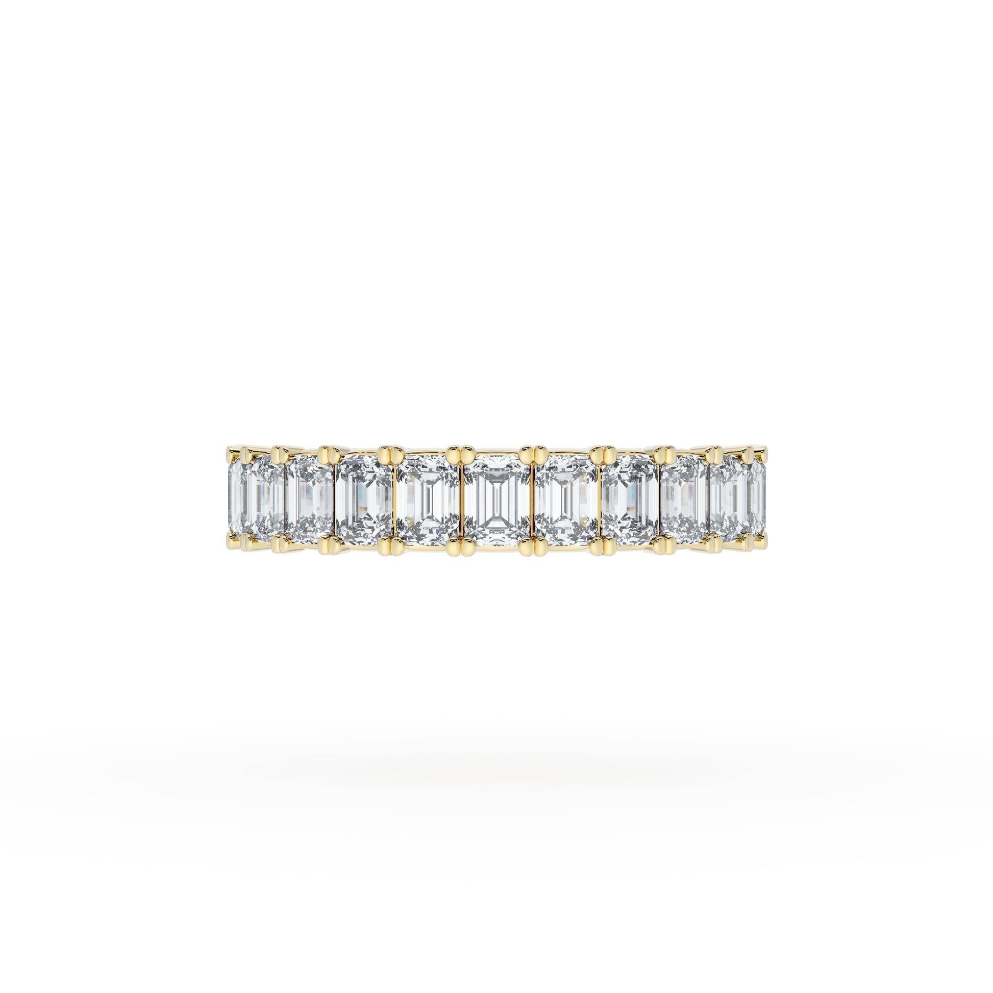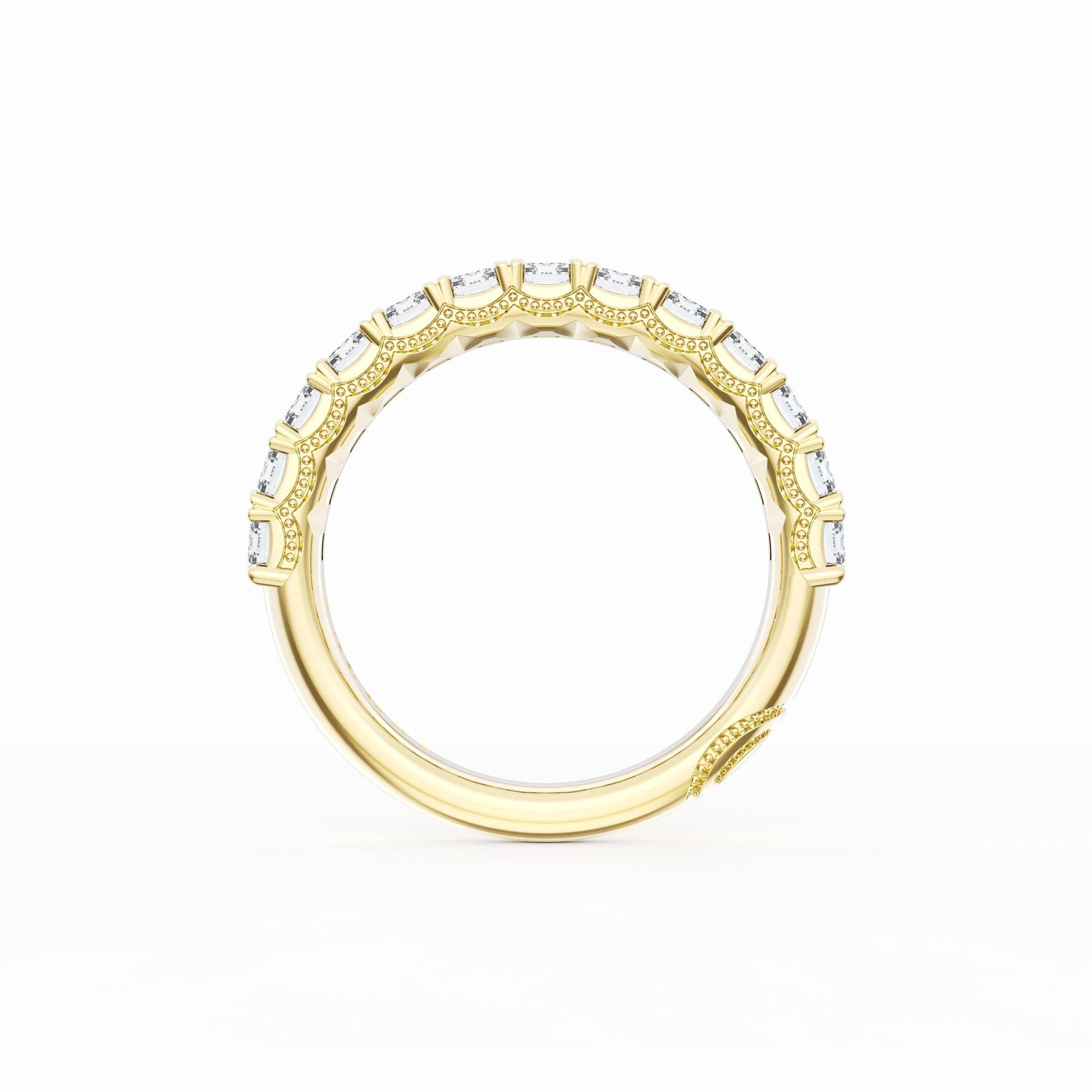 Emerald cut diamonds decorate the ceiling of this 18K Yellow Gold band and milgrain adds intricate texture to the silhouette.