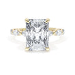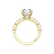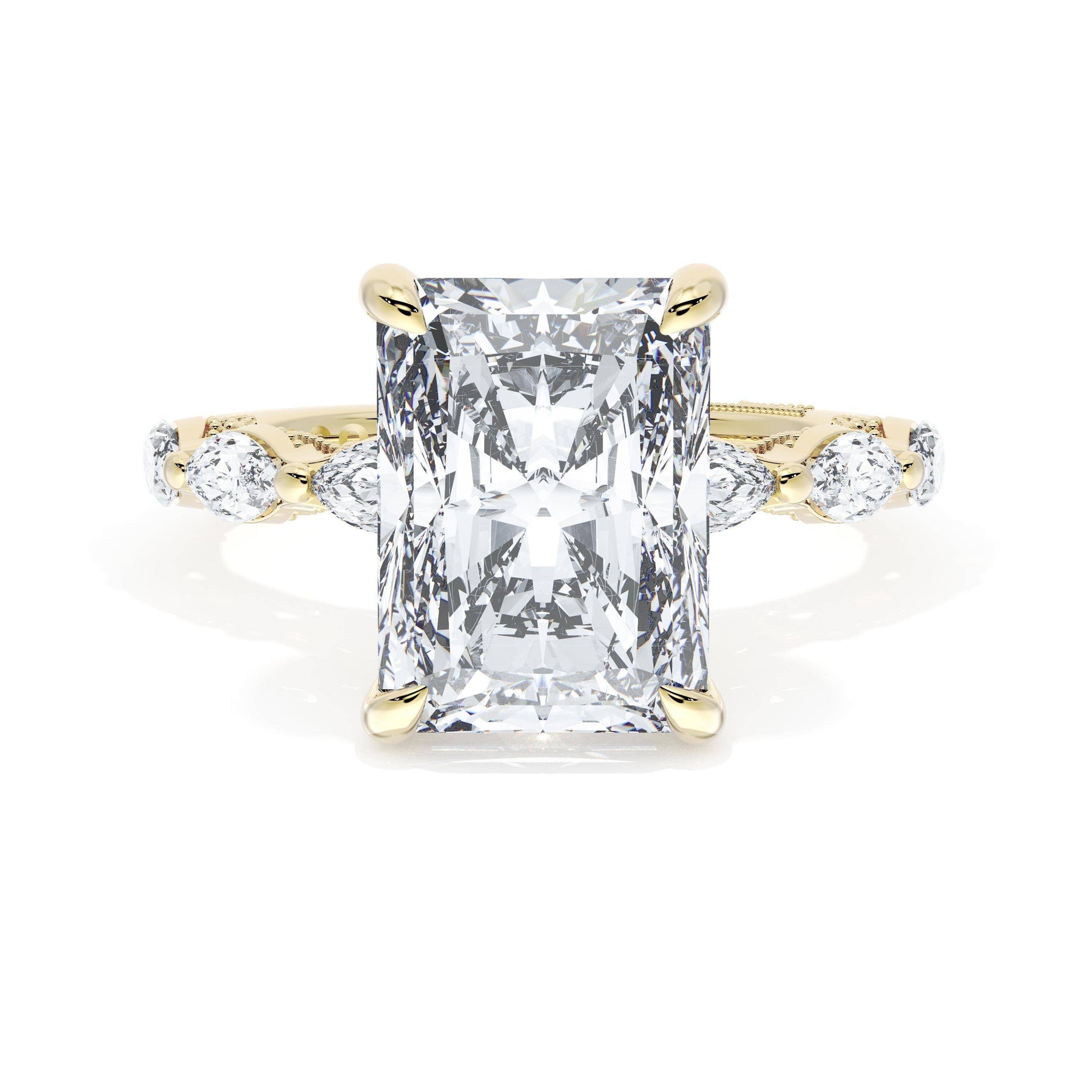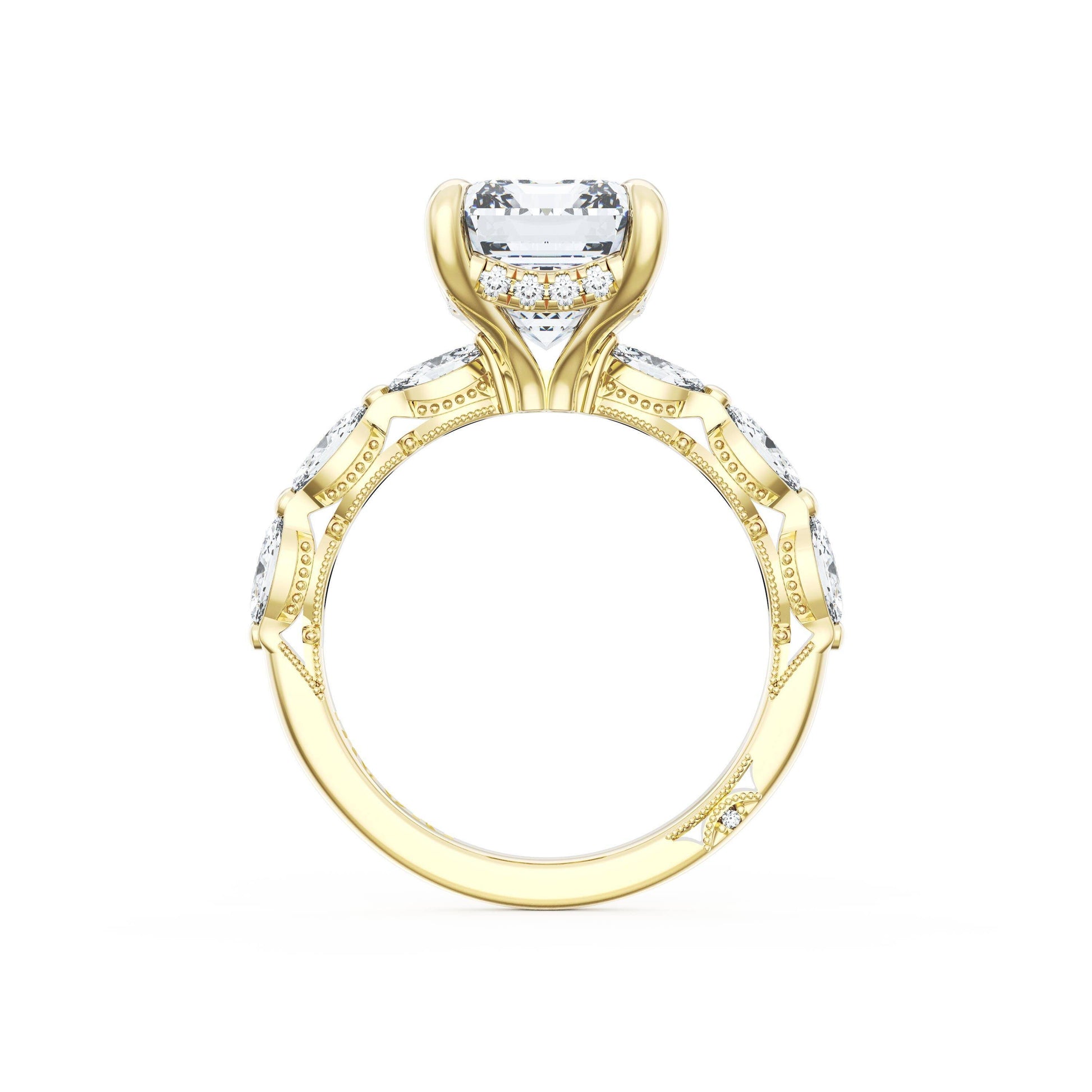 Six marquise cut side stones decorate the ceiling of this 18kt Yellow Gold Radiant cut solitaire. A hidden bloom and milgrain on the silhouette add hidden detail.